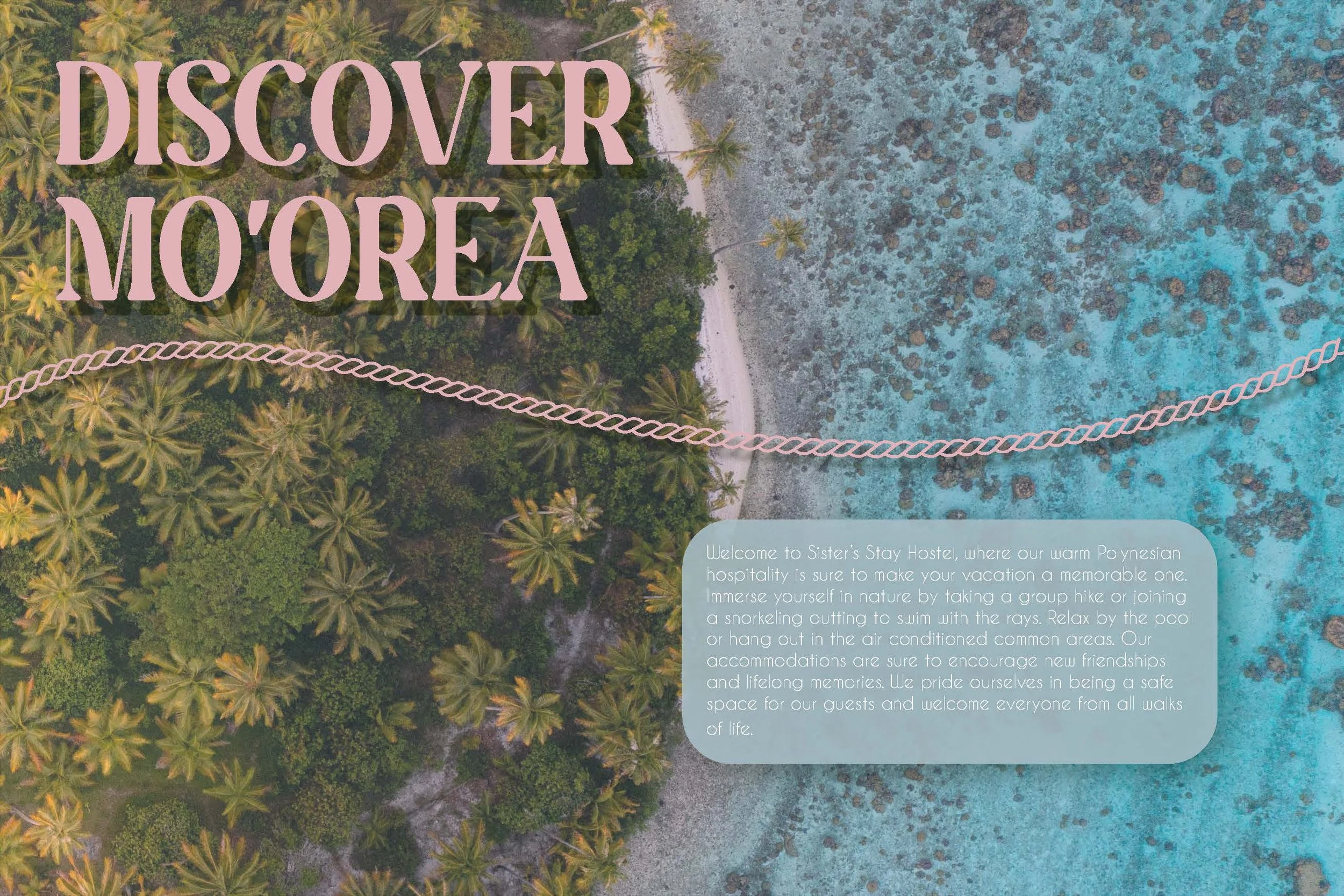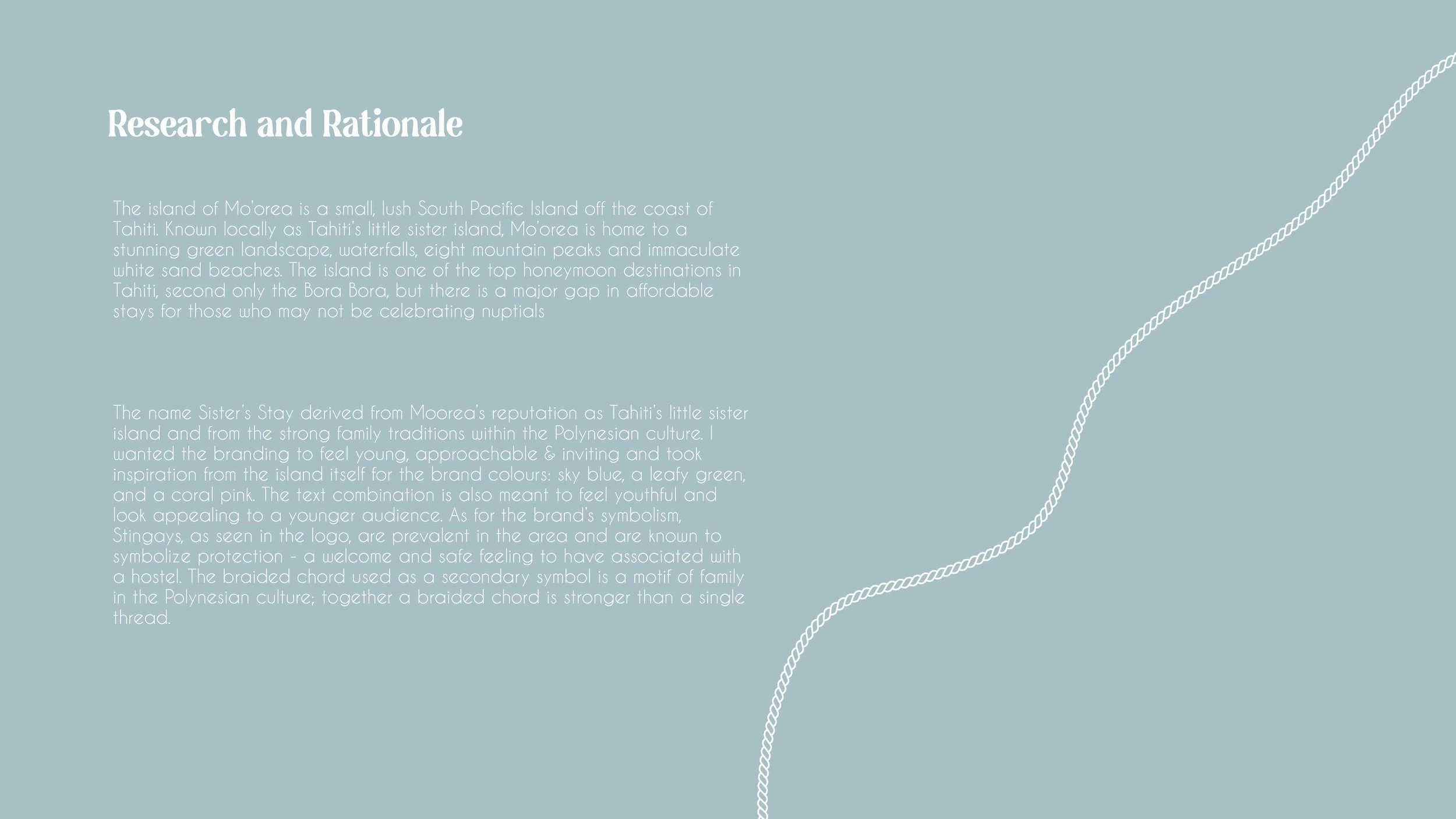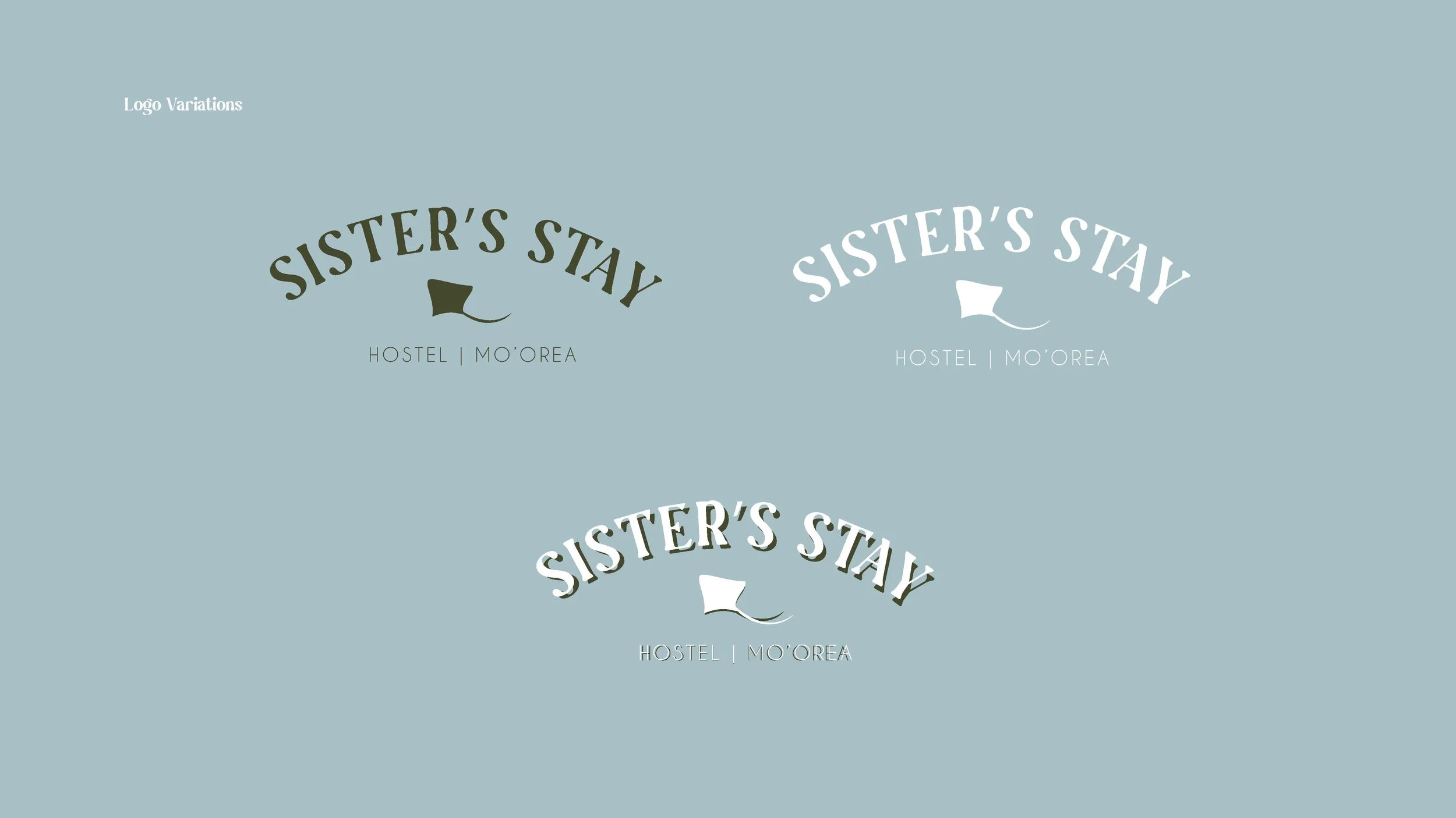 The Design: The name Sister’s Stay derived from Mo’orea’s reputation as Tahiti’s little sister island and from the strong family traditions within the Polynesian culture. I wanted the branding to feel young, approachable & inviting and took inspiration from the island itself for the brand colours: sky blue, a leafy green, and a coral pink. The text combination is also meant to feel youthful and look appealing to a younger audience. As for the brand’s symbolism, Stingrays, as seen in the logo, are prevalent in the area and are known to symbolize protection - a welcome and safe feeling to have associated with a hostel. The braided chord used as a secondary symbol is a motif of family in the Polynesian culture; together a braided chord is stronger than a single thread.